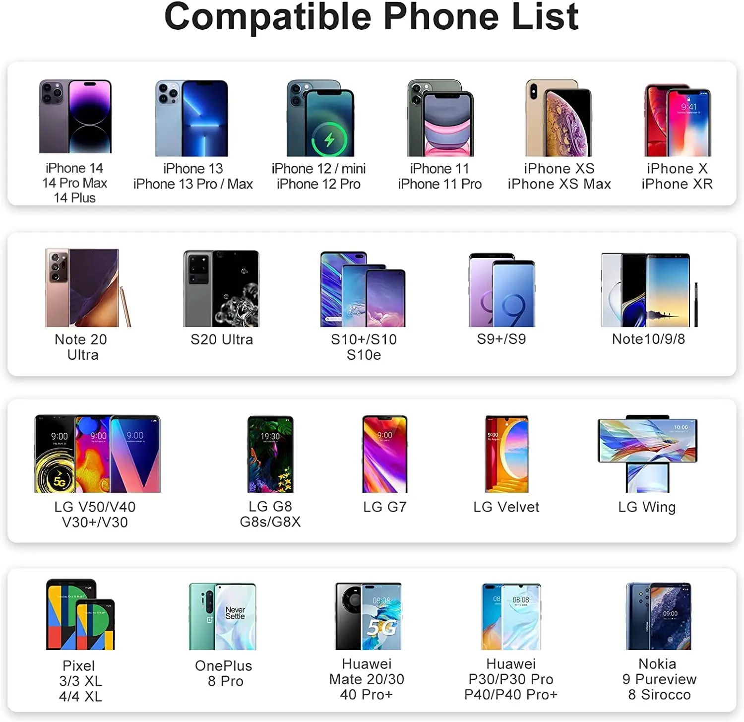 If you don’t want wireless charging, you can also charge limitedly, we haveCompatible Phones: CarQiWireless charger is compatible with iPhone 14 /iPhone 14 Pro / iPhone 14 Pro Max/ iPhone 14 Plus/ iPhone 13 mini/ iPhone 13 Pro/ iPhone 13 Pro Max/ iPhone 12 Pro / 12 / 12 Mini / SE (2020) / 11/ 11 Pro / 11 Pro Max / XS Max / XR / XS / X / 8 / 8 Plus, Samsung Galaxy S20 / S10 / S9+ / S9 / S8 / S8+ / S7 edge / S7 / S6 edge+ Samsung Note 10 / Note 9 / Note 8 / Note 7, Pixel 3 / Pixel 3XL and All Qi enabled phones and devices designed a limited USB port.
